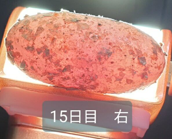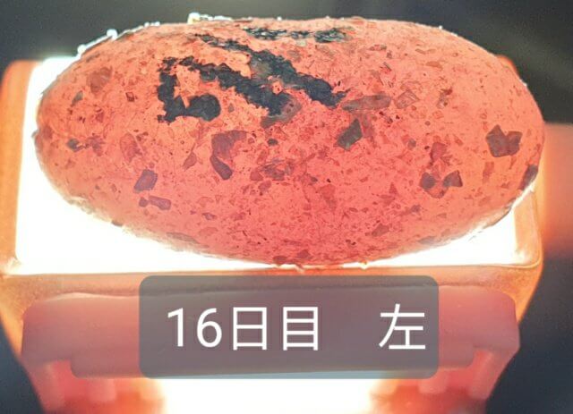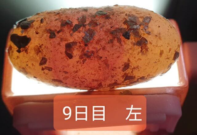 黄色みが少なくなり、卵全体がピンク色っぽくなってきました。全体に血管が広がりだした証拠かな?10日目を超えてこの感じだといい感じのような気がしますね。