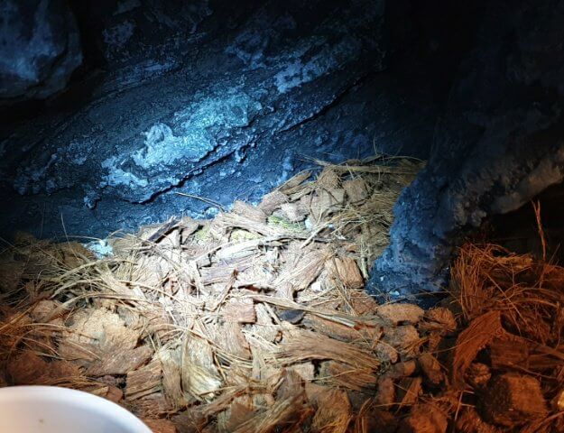 正解は、ここです!!クリックすると大きく見ていただけます。オスかメスかはわかりませんが、一匹ここにいました。こんな感じでマラカイトについては夜の生存確認をしています。