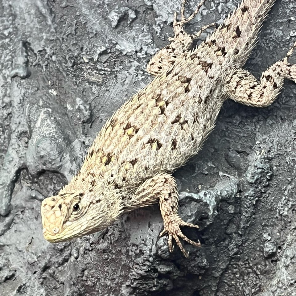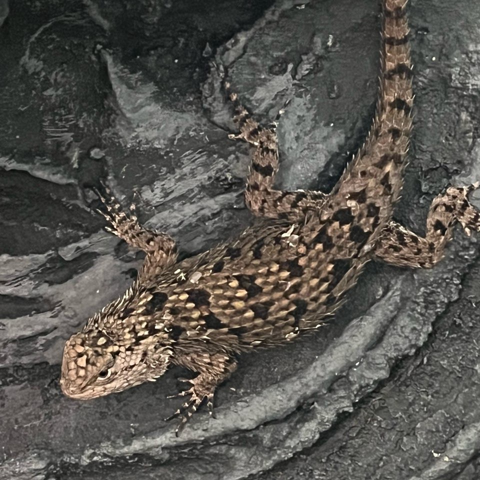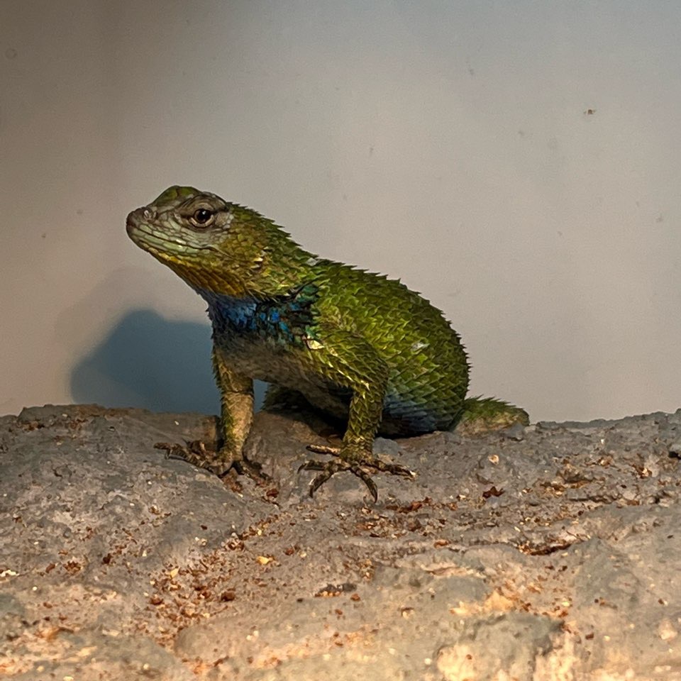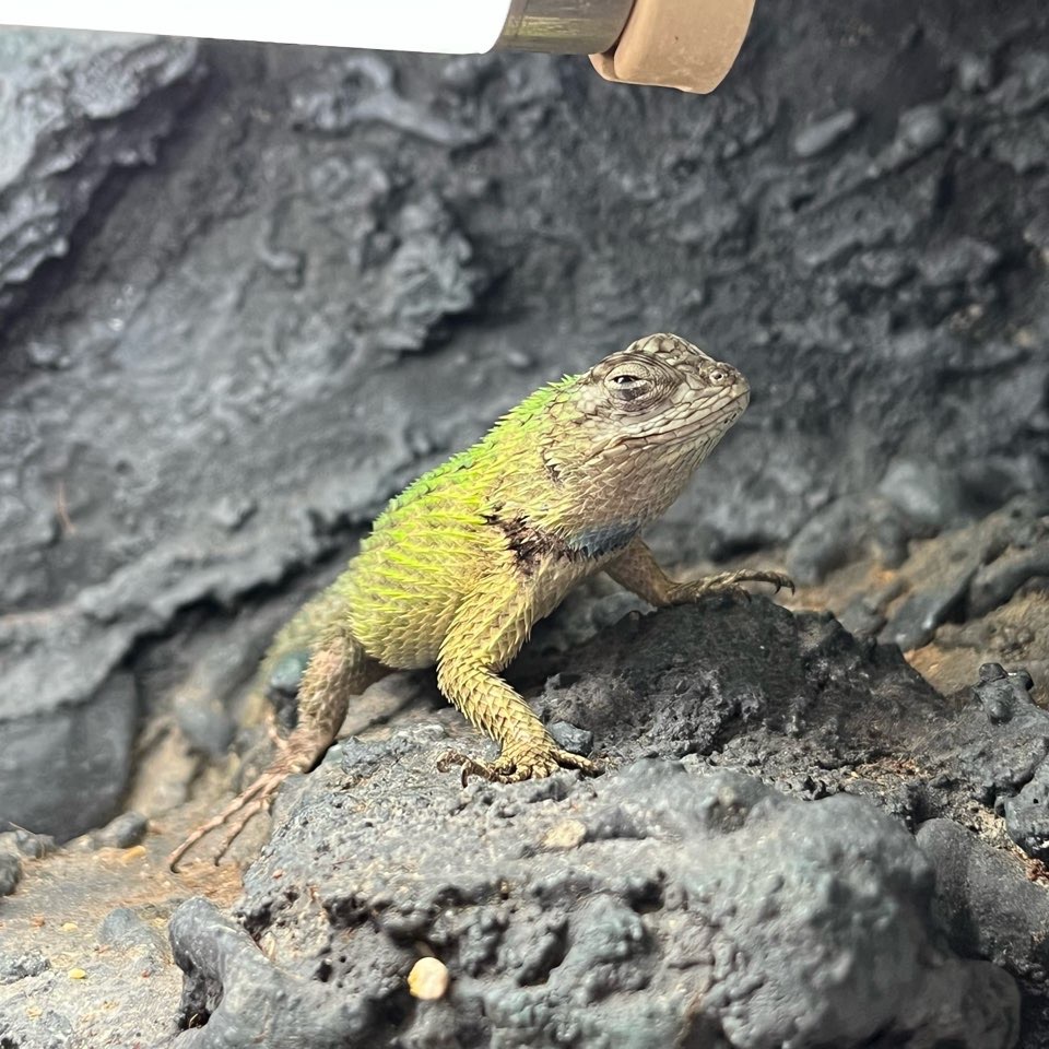 マラカイトハリトカゲのお世話をしようと思ってケージを開けたらエサと思って飛びついてきました。水を交換するつもりだったんだけど(^-^;)