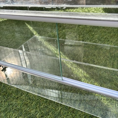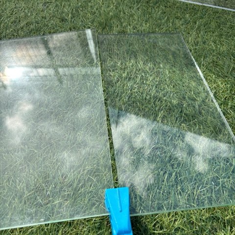 一番最初、半分くらい切れ目が入らないといけないと思い、何度も線を引いていました。そうすると線と全く関係ないところでバリっと割れてしまいます。「え?こんな軽くでいいの?」くらいがちょうどいいです。これがわかるまでに何枚かガラスを無駄にしました(^-^;)