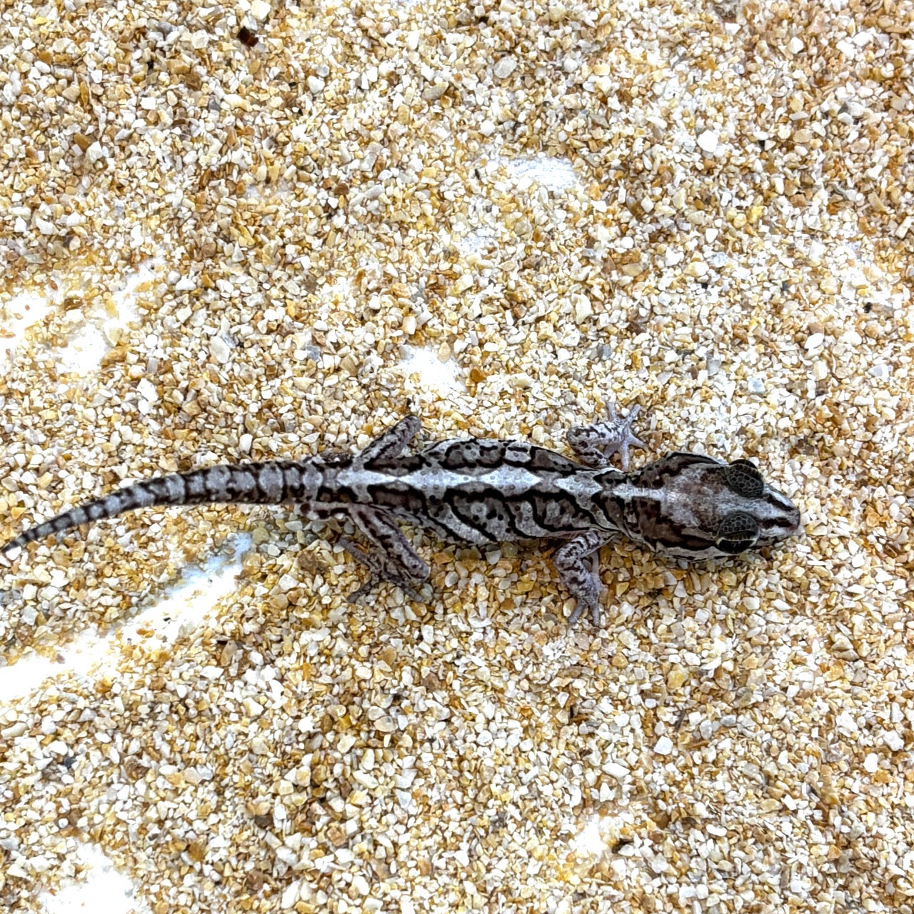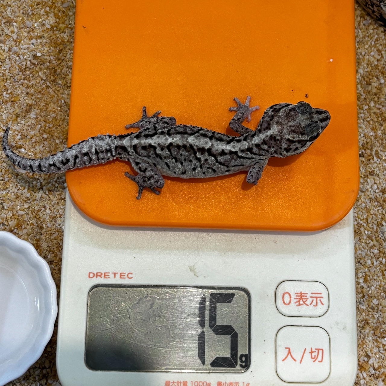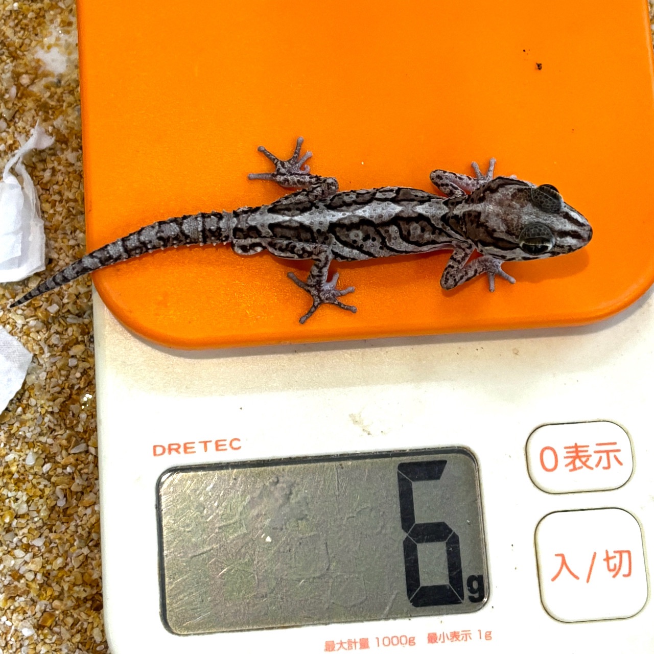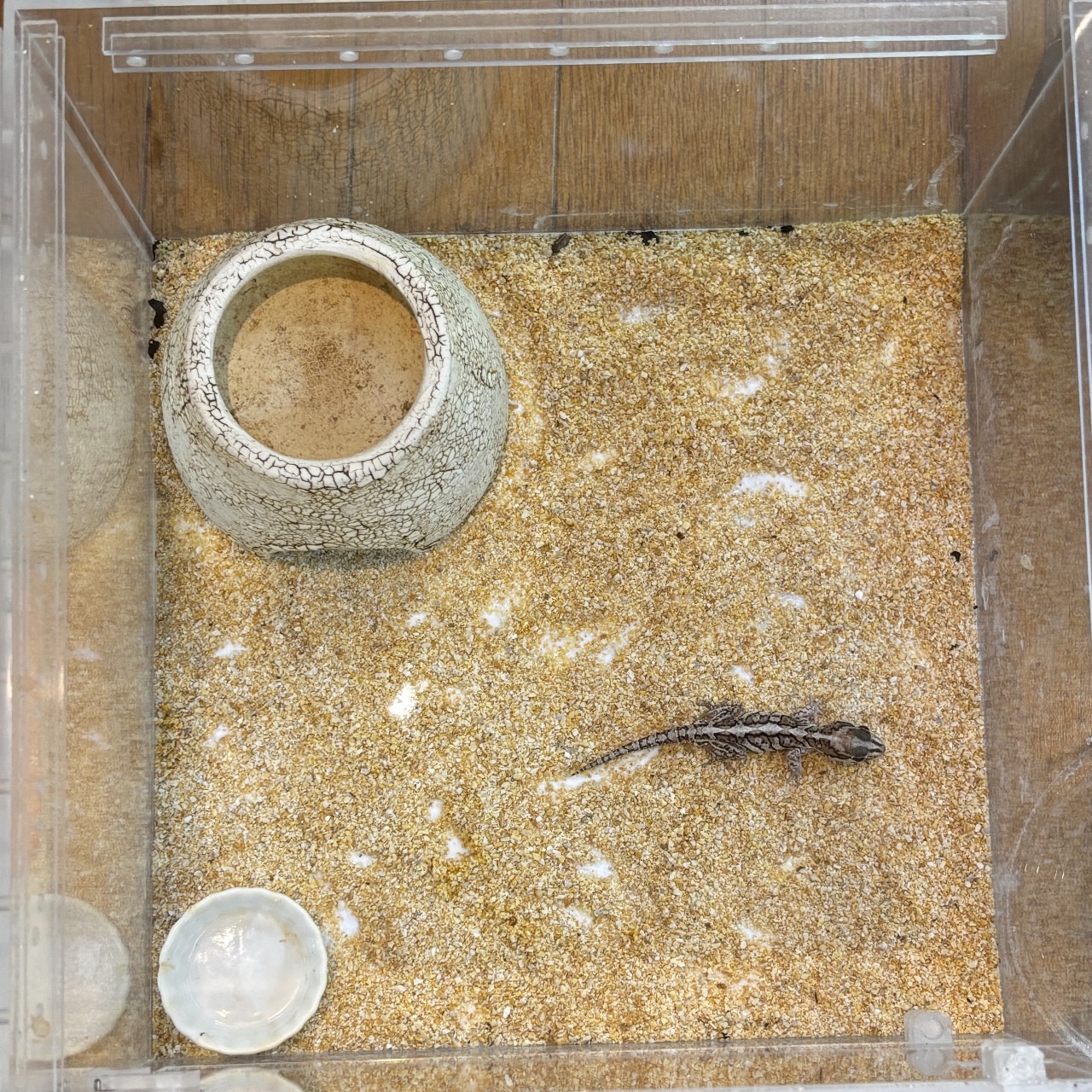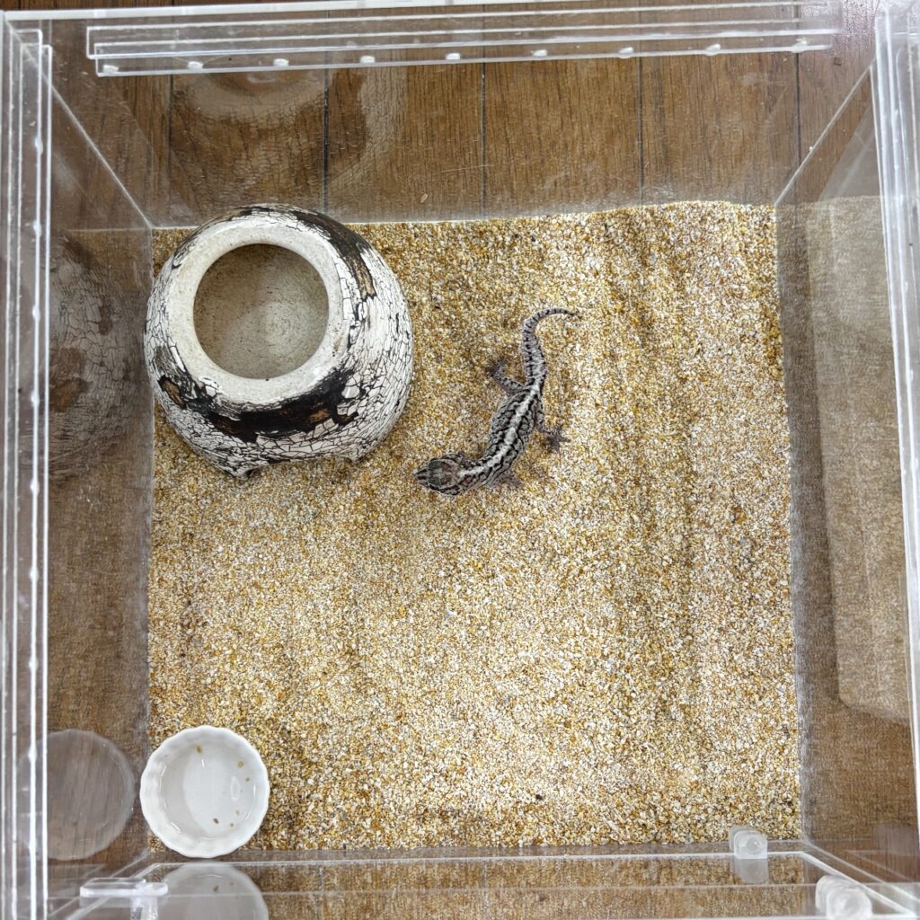 ストレスを与えてたりすると色が暗くなってもどらなくなるというアドバイスをいただいたので、なるべくストレスがかからないように広めのスペース、落ち着く床材をチョイスしてみました。床材はカルシウムサンドです。少し量が少なかったのでそのうち足します。