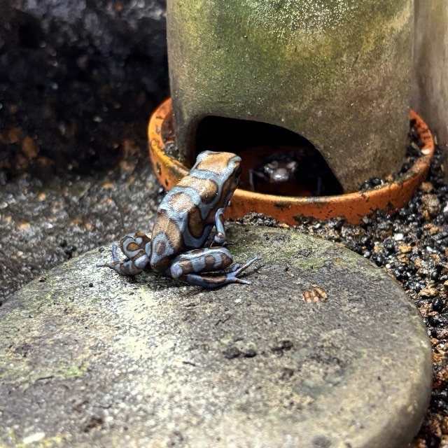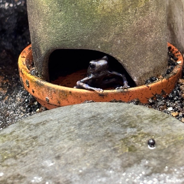 そして、もう一匹は超古参になってきました。4年目のマダラヤドクガエル スーパーブルーです。スーパーブルーも何回も追加したのですが、扉の閉め忘れやいろんなトラブルでこの子だけが残りました。