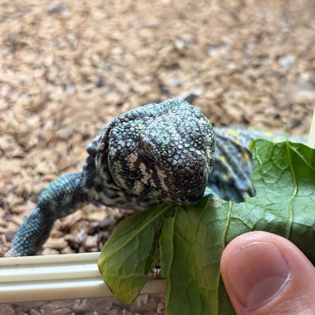 と思いつつ、すぐに戸を開けて小松菜をエサ皿にセットしようと思ったのですが、それまでにこうやって食べに来てがつがつ食べるので、なかなかエサ皿に盛ることが出来ませんでした。